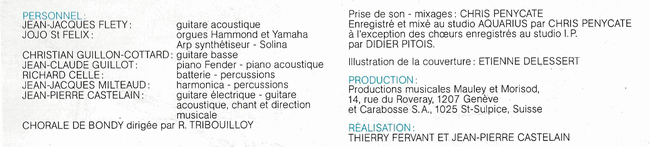 Sous l’appellation « Personnel :», on notera la présence de Jean-Jacques Fletty (Atoll) , Jojo St Félix, Christian Guillon-Cottard, Jean-Claude Guillot, Richard Celle (Look de Paris) et Jean-Jacques Milteau.